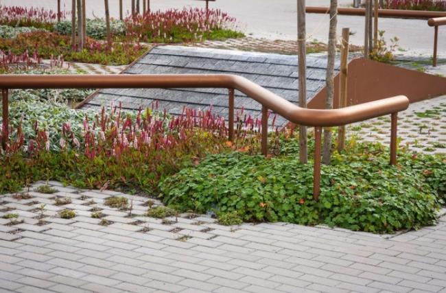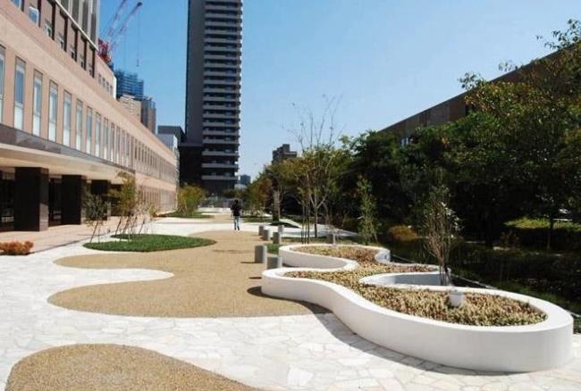 設(shè)計(jì)師在道路邊界設(shè)置了不同形狀的扶手,一方面可以保護(hù)植物,一方面可以為醫(yī)院殘障病人提供輔助。