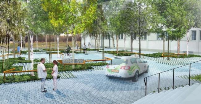 入口的鋪裝表面轉(zhuǎn)變?yōu)榫G色廣場(chǎng),在那里保留了往返醫(yī)院的車輛停車位。