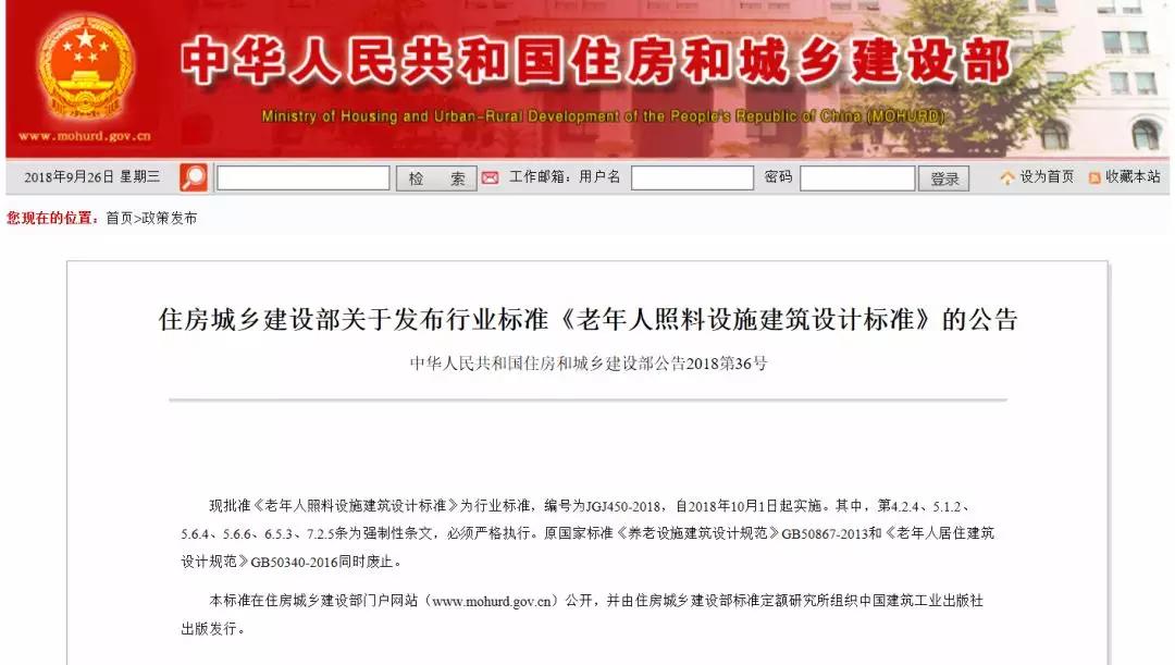 中華人民共和國(guó)住房和城鄉(xiāng)建設(shè)部 - 住房城鄉(xiāng)建設(shè)部關(guān)于發(fā)布行業(yè)標(biāo)準(zhǔn)《老年人照料設(shè)施建筑設(shè)計(jì)標(biāo)準(zhǔn)》的公告