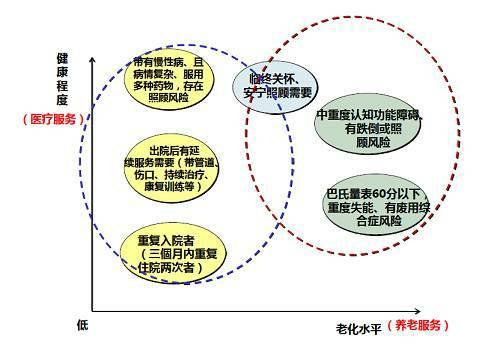 醫(yī)養(yǎng)結(jié)合是將現(xiàn)代醫(yī)療服務(wù)技術(shù)與養(yǎng)老保障模式有效結(jié)合,實現(xiàn)了“有病治病、無病療養(yǎng)”的養(yǎng)老保障模式創(chuàng)新。近似于美國的管理性醫(yī)療服務(wù),基于資源整合理論。不是簡單的醫(yī)療與養(yǎng)老職責的相加,需要滿足資源利用合理化基本原則,包括:精準合理的服務(wù)定位、政策配套與頂層設(shè)計、醫(yī)療和養(yǎng)老服務(wù)模式有機整合、按供需平衡需要合理配置資源、資源共享避免重置與浪費。社會化養(yǎng)老服務(wù)的剛需來源于自我照顧能力不足的老人,或家庭功能或照顧者能力不足的老人,而這其中如果將養(yǎng)老服務(wù)與醫(yī)療服務(wù)需求作為兩個需要維度的話,強調(diào)老年照顧中的醫(yī)療和照護兩個方面。