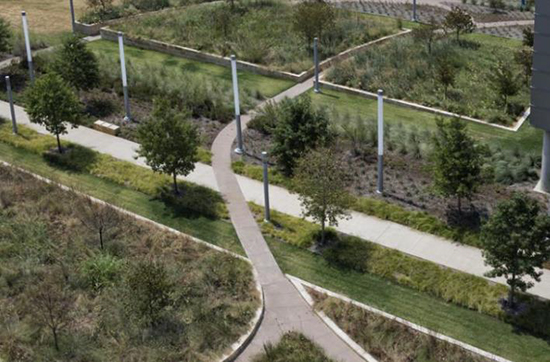 設(shè)計(jì)方案與整體的景觀設(shè)計(jì)相映襯,包括周邊的街景、停車場(chǎng)花園、入口廣場(chǎng)、健康花園、庭院、綠色屋頂、線性花園、沉思區(qū)和活動(dòng)線路。一個(gè)多感官的本土景觀將這些顯著的特色景觀聯(lián)系起來,同時(shí)收集和運(yùn)輸生態(tài)濕地(蜿蜒穿行于各種庭院、花園和醫(yī)院區(qū)域的公園)中的雨水。