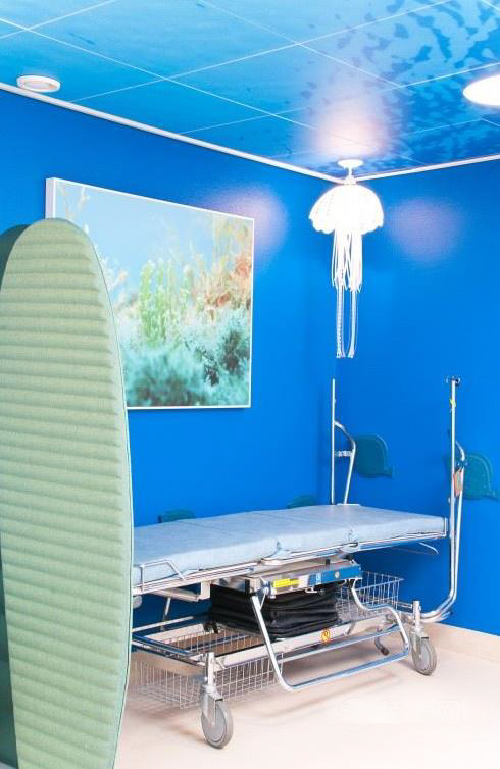 醫(yī)院大多以TheHarbour、The Rock、Under Water、The Bridge的命名方式,讓小患者不再恐懼,安心接受診療。而走到深海區(qū)便會(huì)發(fā)現(xiàn)更多有趣的細(xì)節(jié),當(dāng)小患者躺在病床吊點(diǎn)滴時(shí),印入眼簾的是白色水母造型的吊飾,一伸手就能摸到旋在半空中的觸角;墻壁上掛有可愛(ài)的魚(yú)兒裝飾,就像魚(yú)兒結(jié)伴從身旁游過(guò)。
