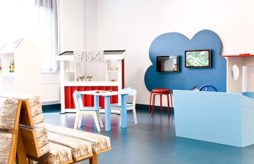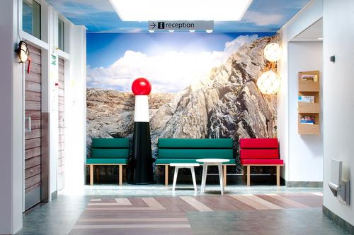 醫(yī)院里的每個(gè)空間都有獨(dú)特的主題,例如酒店接待處的白色柜臺(tái)、旅館單人房型的X光室、懸崖旁的軟沙發(fā)休息區(qū)……而且每個(gè)空間搭配明亮的燈具使室內(nèi)采光非常好,充滿溫暖,并營(yíng)造出活潑的氣氛。