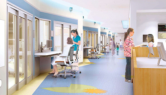 比如,斯坦福兒童健康中心的室內(nèi)設(shè)計中,參考了自然景觀的主要色調(diào),通過地面鋪裝、標識符號、藝術(shù)裝置等方式加以抽象演繹,使兒童仿佛置身奇妙的童話世界。另外,醫(yī)院等候空間和走廊處懸掛的裝飾藝術(shù)品也很吸引眼球,如此人性化情感設(shè)計,可以為兒童和家長創(chuàng)造輕松愉快的就醫(yī)體驗。