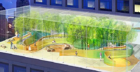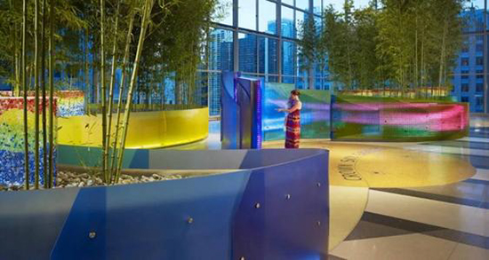 比如,芝加哥一兒童醫(yī)院空中花園就是自然化設(shè)計表達的典型案例?;▓@位于11層,由玻璃溫室覆蓋,患者可以感受室外季節(jié)與氣候的變化,從而感到輕松自然又愜意。花園依據(jù)患者行為路徑與心理活動,布置了竹子、天然石,水體等自然元素,為患者提供一個減壓與冥想的空間。彩色樹脂墻體上設(shè)置了LED板和運動感應(yīng)器,當患者走過時會變幻動態(tài)的色彩組合,仿佛墻面被賦予了生命,具有動感和趣味。