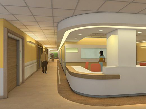 走廊地面材料使用彈性地材為好,噪音低、舒適度強(qiáng),能給患者提供一個(gè)安全、衛(wèi)生、易清潔的醫(yī)療環(huán)境,護(hù)士站臺(tái)要考慮殘疾人,低位柜臺(tái)應(yīng)是無障礙設(shè)計(jì),以體現(xiàn)人性化服務(wù)。