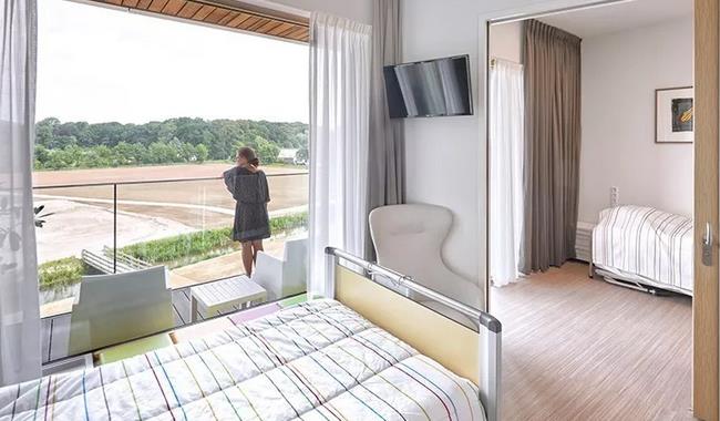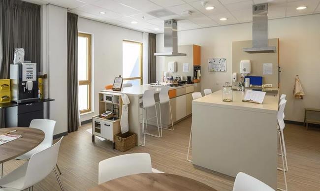 2樓和3樓設(shè)有帶廚房的用餐室。廚房設(shè)備齊全,配有洗碗機(jī),只要提前預(yù)約、自備食材,就可以在這里做飯、用餐,非常有生活氣息。病房是套間規(guī)格的,患兒及家屬能享受到戶外風(fēng)景,室內(nèi)配備了簡(jiǎn)單的家具,家長(zhǎng)可以睡在相鄰的房間,以便隨時(shí)照顧孩子。